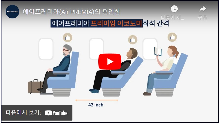 에어프레미아의 가장 좋은 좌석은 프리미엄 이코노미 클래스로 좌석 간격은 42인치입니다. 모든 노선에 음료, 기내식이 제공이 되며 단거리 노선을 제외하면 어매니티도 증정합니다. 에어프레미아에 또 다른 좌석인 이코노미 클래스는 35인치의 좌석을 제공합니다.