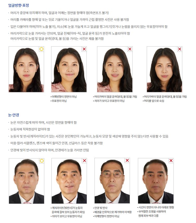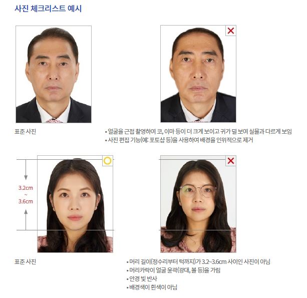 국제민간항공기구에서 정한 기준에 따라 여권은 촬영된지 6개월 이내 사진으로 본인임이 확인될 수 있는 변형이 되지 않은 사진만 가능합니다. 상황에 따라 규격에 맞지 않으면 여권접수 지연, 반려 또는 불가의 상황이 발생할수도 있습니다.