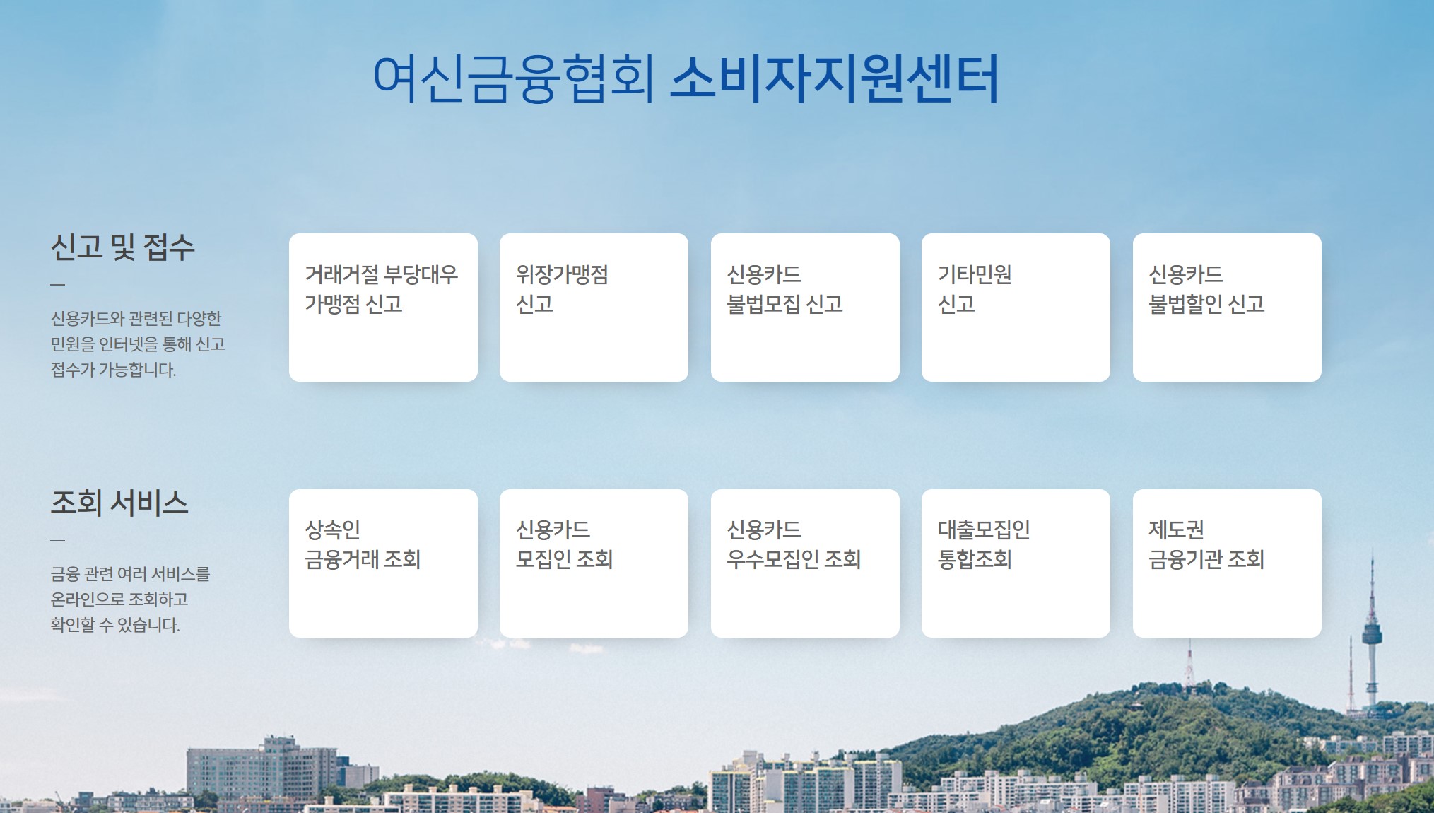여신금융협회 소비자지원센터에서는 신용카드와 관련한 다양한 민원을 인터넷으로 간편하게 신고접수를 할 수 있습니다.