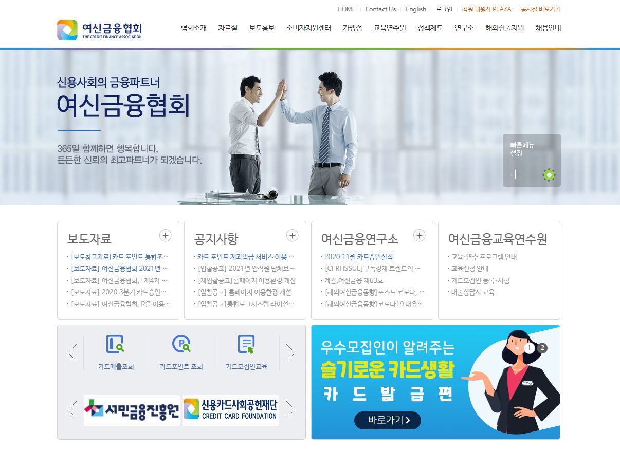 여신금융협회 홈페이지 접속시 보게되는 첫번째 화면입니다. 깔끔합니다.