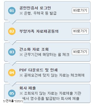연말정산 간소화 서비스 이용절차는 아래와 같습니다. (공인인증서 로그인 - 부양가족 자료 제공동의 - 간소화 자료 조회 - pdf 다운 및 인쇄 - 회사 제출) 공인인증서 로그인 전 은행 및 우체국 등에서 발급 하여야 합니다. 간소화 자료 조회시에는 근무기간에 해당하는 월을 체크한 후 조회가 가능합니다. PDF 다운 및 인쇄를 하는 경우 공제요건에 맞지 않는 자료는 체크를 해제 합니다. 회사 제출시 조회되지 않는 자료는 자료제출 기관에서 영수증을 발급받아 회사에 제출합니다.