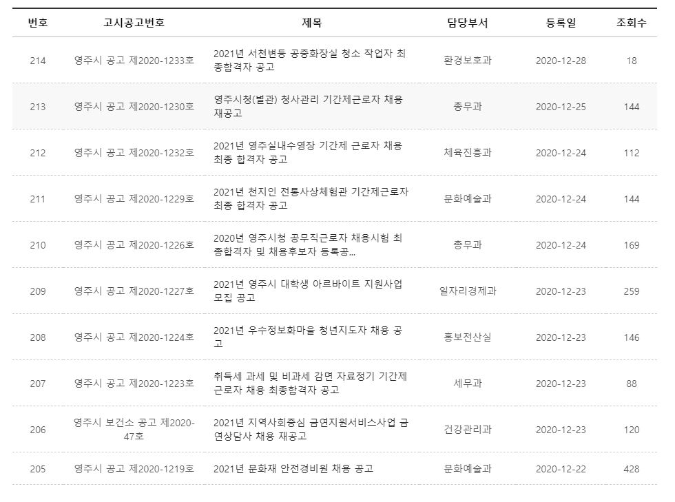 영주시청 홈페이지에서 볼 수 있는 채용공고입니다.