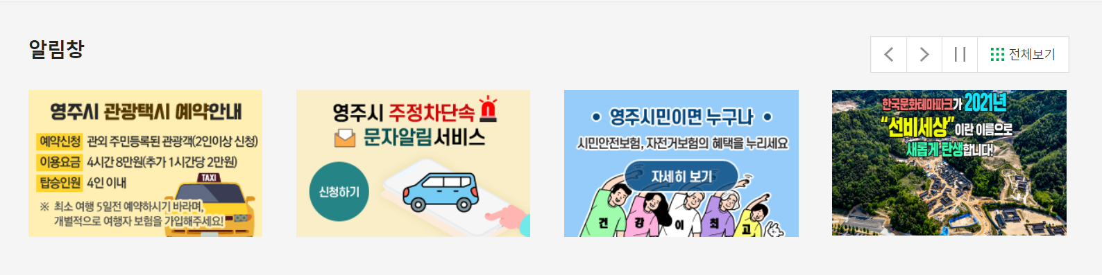 홈페이지 첫화면하단에는 알림창이 있어서 영주 관광택시 정보라든지 영주시 내의 주정차단속 문자알림서비스 신청창이 있습니다.