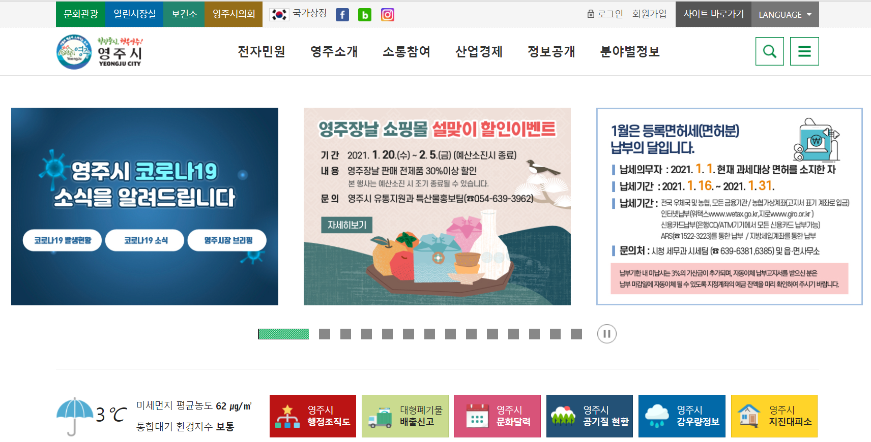 이 외에도 영주시 문화관광정보 코로나19현황 영주시 대형폐기물배출신고 강우량또는공기질정보가 있습니다. 아, 많은 분들이 궁금해하는 채용공고도 있네요. 하여튼 유용한정보가 많은 홈페이지입니다.