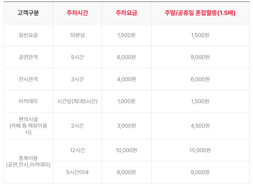 - 예술의 전당은 주말/공휴일 할증요금 재개 및 친환경차량, 경차 중복할인을 중지합니다. (연중 주말 및 공휴일 상시만차로 인한 주차 어려움)