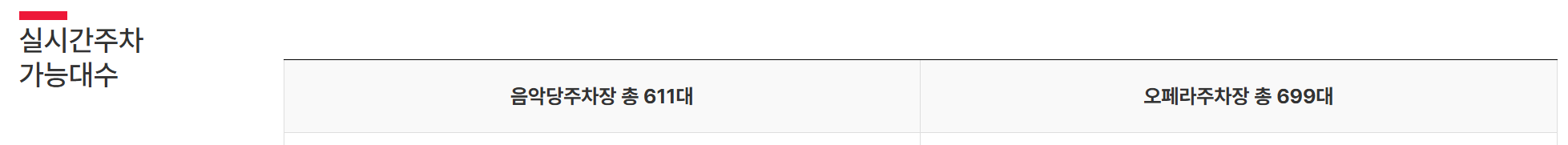 - 음악당주차장 총 611대, 오페라주차장 총 699 대중 주차 가능한 대수를 바로 확인할 수 있어요.