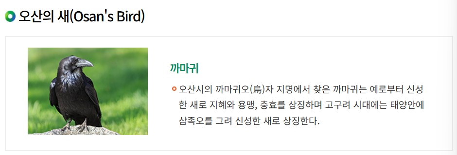 오산의 새 까마귀는 까마귀 오자 지명에서 찾은 까마귀로 예로부터 신성한 새로 여겨졌으며 고구려 시대에 태양 안에 삼족오를 그려 신성한 새로 상징한다.