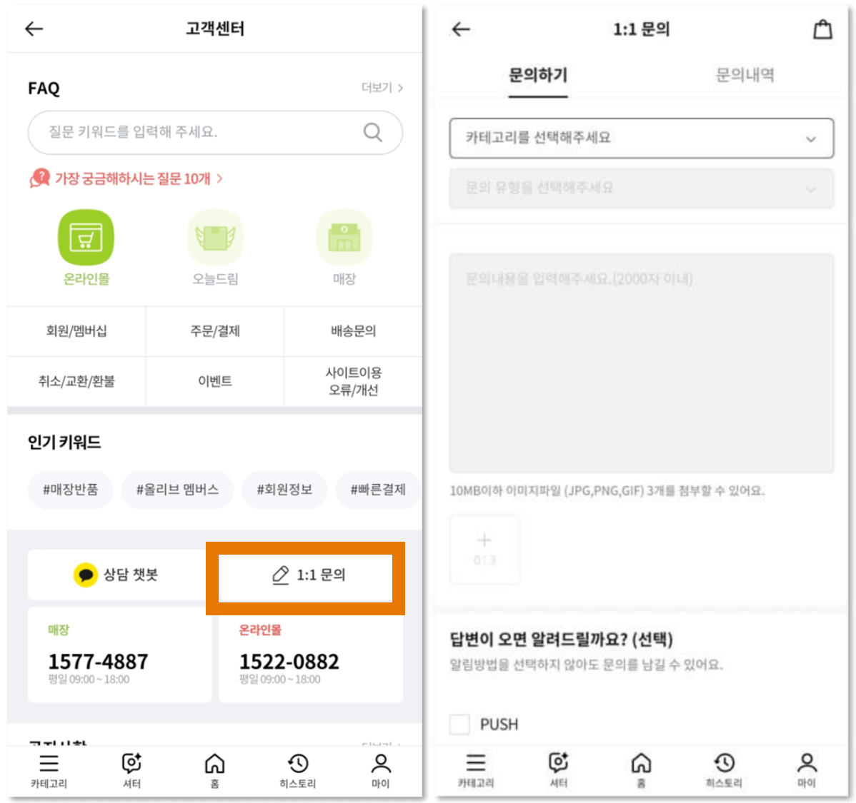 이용방법: 올리브영 앱 접속 ▶ 메인페이지 하단 '마이' 클릭 ▶ 고객센터