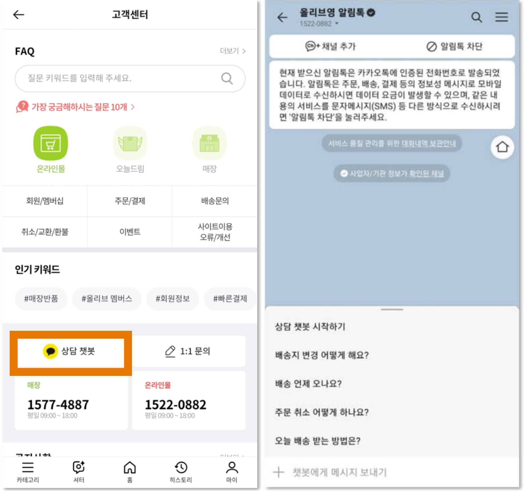 올리브영 상담 챗봇은 24시간 운영합니다. 챗봇을 통해 간단한 문의 및 자주 묻는 질문에 대해 실시간으로 답변받을 수 있고, 상담원 연결이 필요한 경우 고객센터 운영시간 내 상담사와 연결할 수 있습니다. 상담사와 실시간으로 소통할 수 있고 답변을 바로 받을 수 있어 많은 고객들이 이용하는 방법입니다!