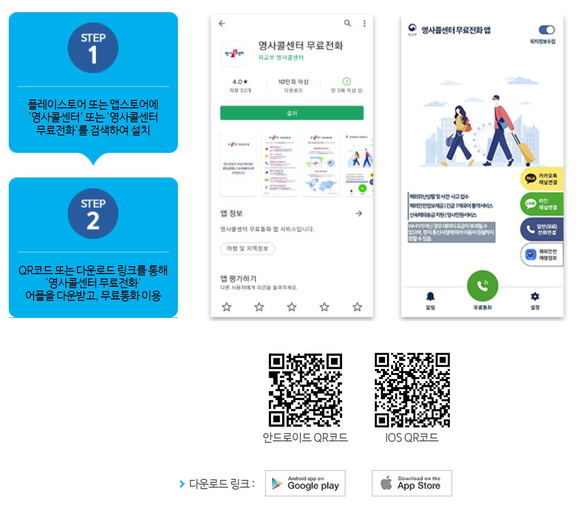 2) QR코드나 다운로드 링크를 이용해 '영사콜센터 무료전화' 어플을 다운하고 무료통화 이용