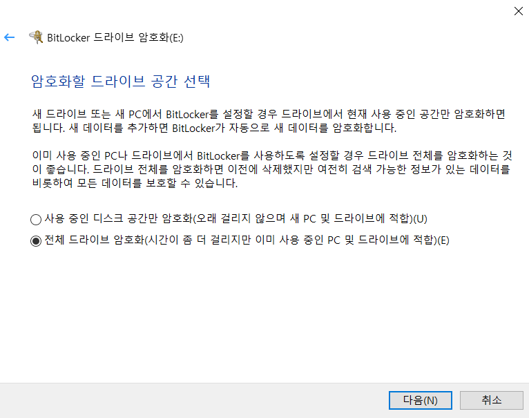 암호화할 드라이브 공간 선택은 읽어보시고 필요한대로 하시면 되고 전체 드라이브 암호화는 모든 데이터를 보호하니까 어지간하면 전체 드라이브 암호화를 하는게 좋습니다.