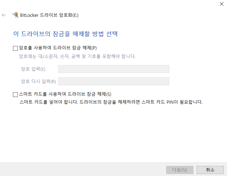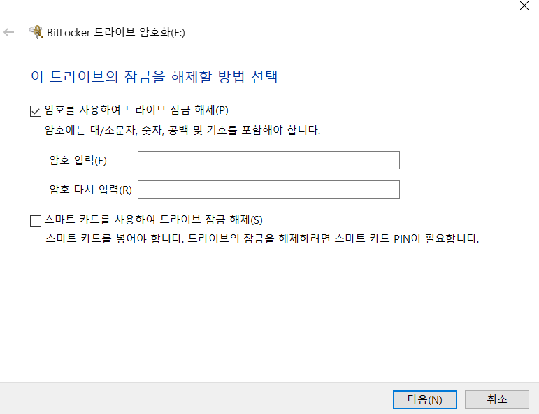 암호를 사용하여 드라이브 잠금해제 버튼을 클릭하시고 암호 설정을 하면 됩니다.