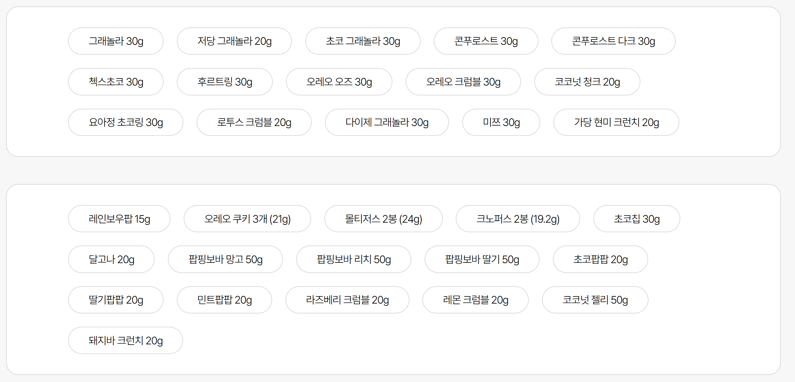 레인보우팝 오레오 쿠키 3개 몰티저스 2봉 크노퍼스 2봉 초코칩 달고나 팝핑보바 망고 팝핑보바 리치 팝핑보바 딸기 초코팝팝 딸기팝팝 민트팝팝 라즈베리 크럼블 레몬 크럼블 코코넛 젤리 돼지바 크런치 |