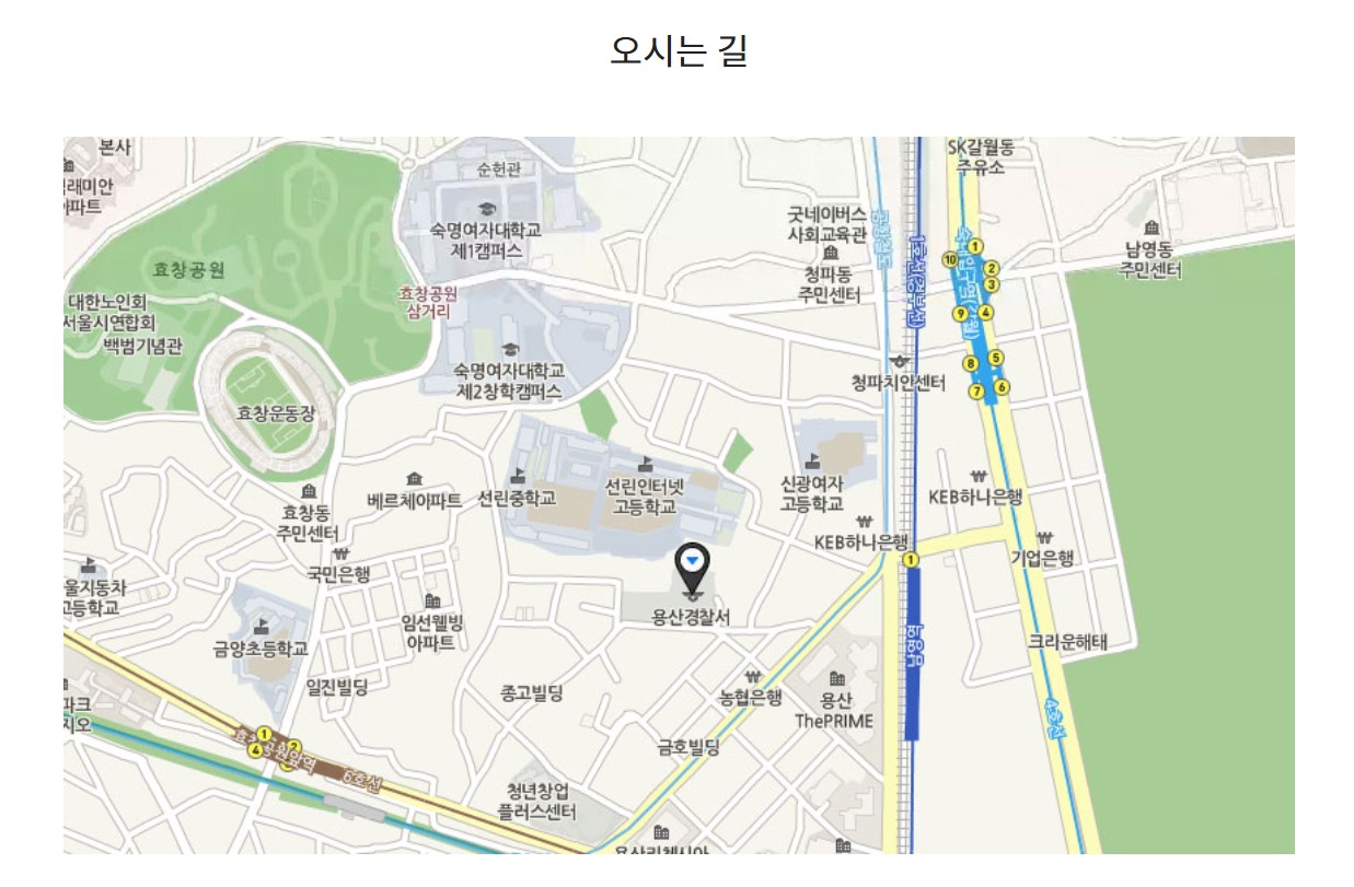 용산경찰서는 서울시 용산구 원효로 89길 24에 위치하고 있으며 4호선 숙대입구(갈월) 역, 1호선 남영역, 6호선 효창공원 앞 역과 가깝습니다. 방문 시 참고하세요.