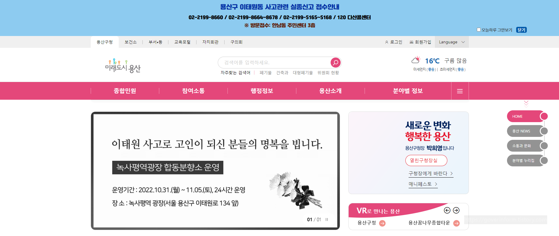 홈페이지 하단에 보면 소통의방이라 하여 생활불편민원신고, 민원신청(나도한마디)가 있습니다. 용산 명소, 산책 코스, 관광 체험 코스, 문화재, 시티투어버스, 전통시장 등 다양한 정보가 있습니다.