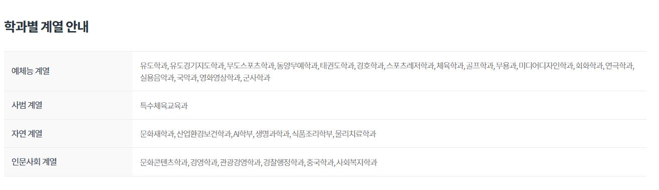 또한 입학을 하기 전 어떤 전공에 지원할지도 중요하게 결정해야될 부분 중 하나입니다. 용인대에는 크게 예체능/사범/자연/인문사회 계열이 있으며 사범 계열에는 특수체육교육과 단일 전공이 있습니다. 자세하게 전공에 대해 알아보고 싶다면 아래 학과별 계열 안내 바로가기를 이용하면 됩니다.