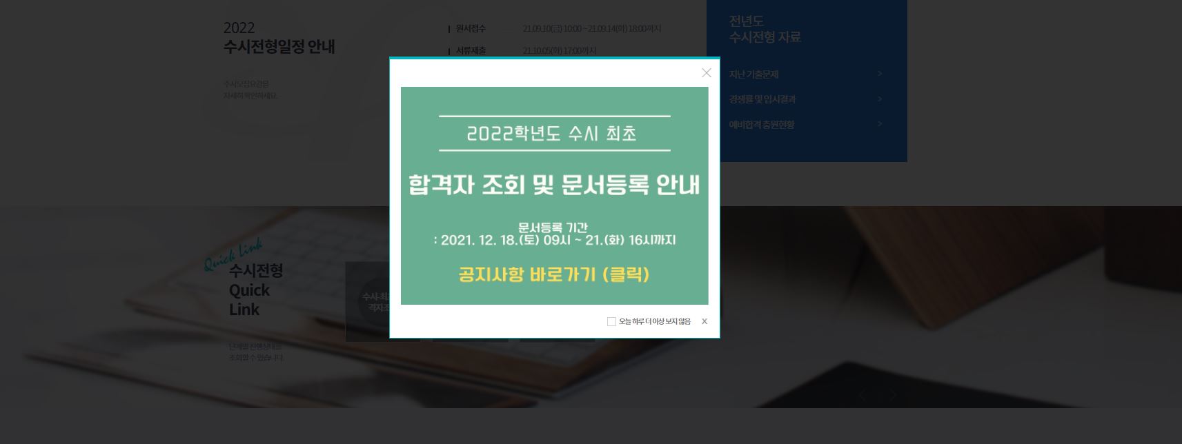 입학처 홈페이지의 첫 화면입니다. 수시/정시/편입생/재외국민과 외국인 모집 전형이 있습니다. 입학도우미에는 입시원서 작성에 필요한 성적 산출과 입학상담 서비스가 있습니다.