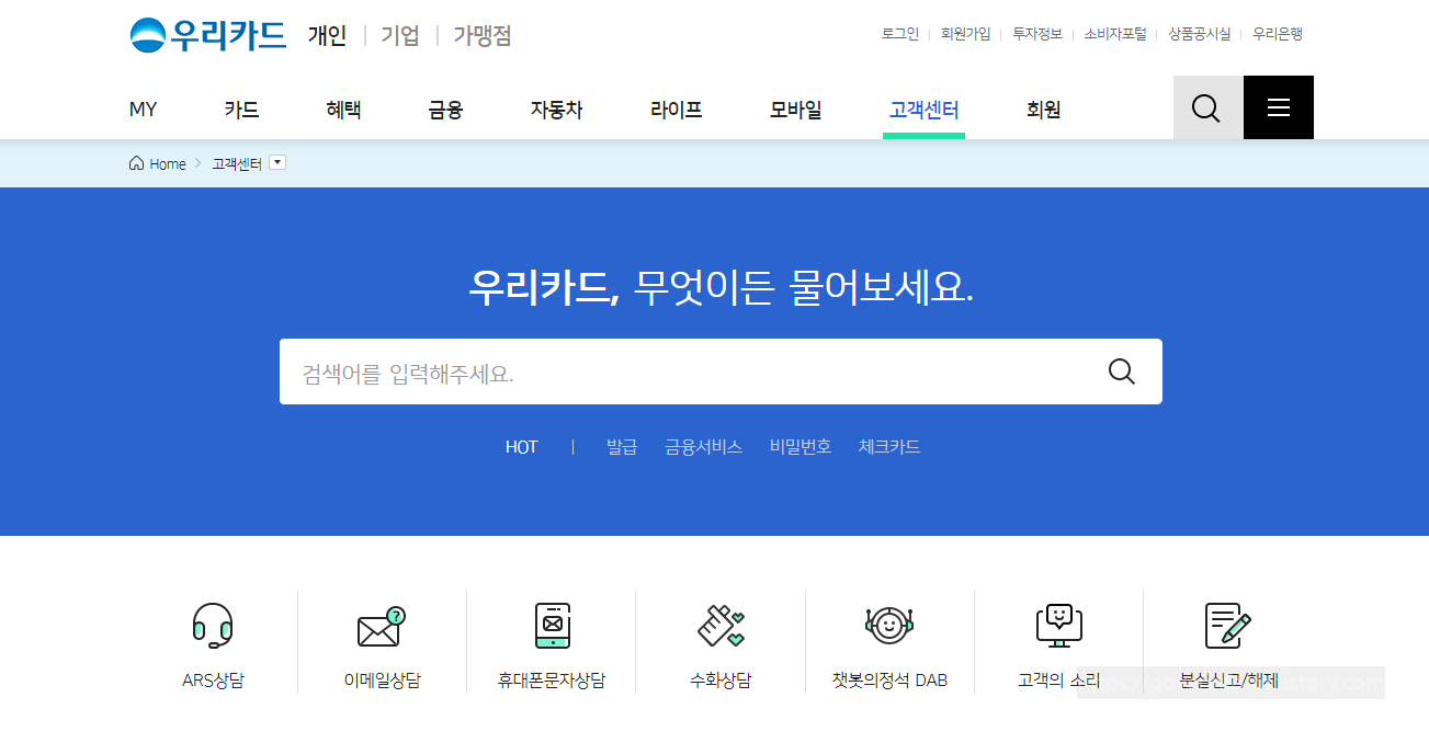 다음은 우리카드 홈페이지 첫 화면입니다. 홈페이지 첫 화면 상단에 MY/카드/혜택/금융/자동차/라이프/모바일/고객센터/회원 메뉴가 있습니다. 고객센터 메뉴로 접속하면 고객센터 홈페이지가 나옵니다.