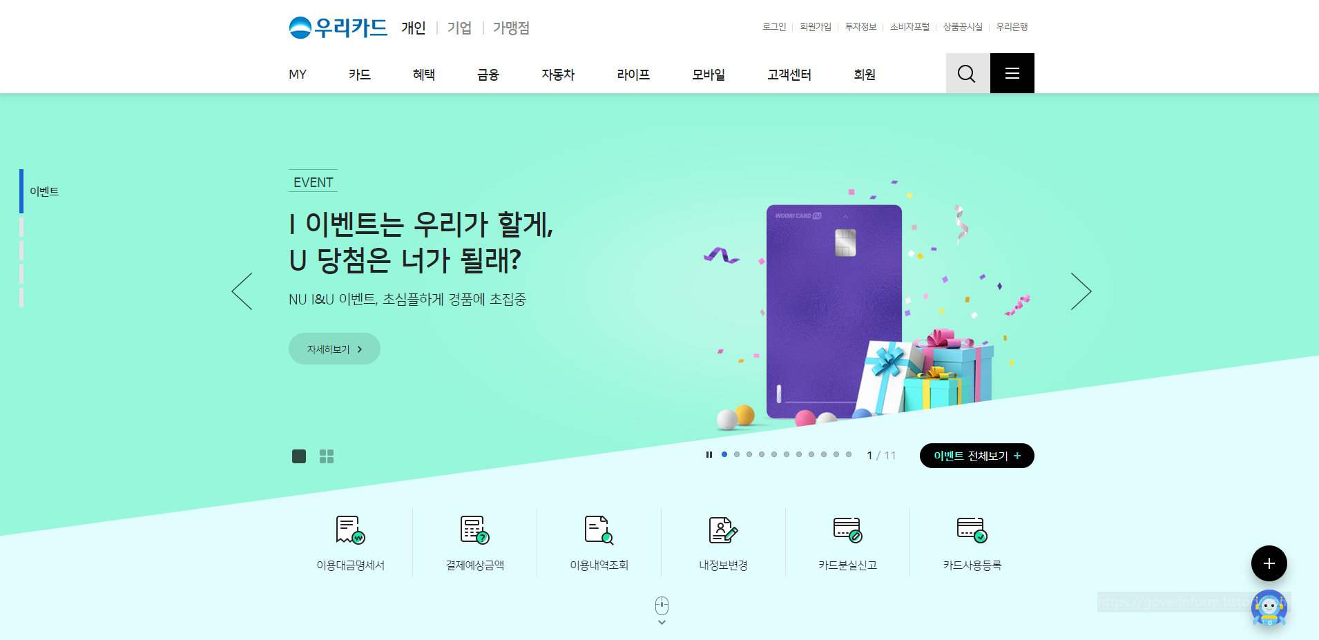 우리카드 홈페이지 바로가기 https://pc.wooricard.com/dcpc/main.do