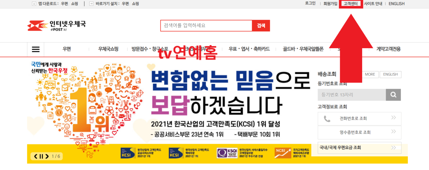 2. 우체국택배 홈페이지에 접속하고 우측상단의 고객센터를 클릭합니다.