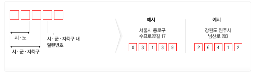 우편번호는 2015년부터 5자리의 구역번호를 우편번호로 사용되고 있습니다. 15년도 이전에는 6자리 수였는데 바뀐 우펴번호가 훨씬 간단하다는 장점이 있습니다. 우편번호의 다섯 자리 중 순차적으로 시군자치구 구별 그리고 자치구내 일련번호로 구성되어있습니다.