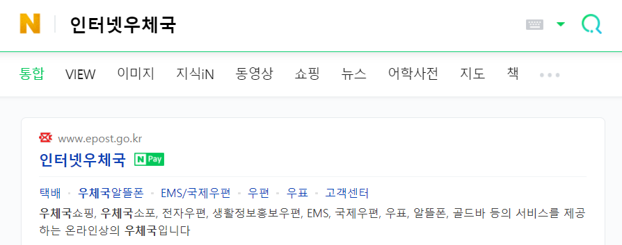 먼저 포털 검색창에 인터넷우체국을 검색하고 다음과 같이 인터넷우체국  www.epost.go.kr  주소가 있는 홈페이지로 접속하면 됩니다. 구글에서 검색해도 됩니다.