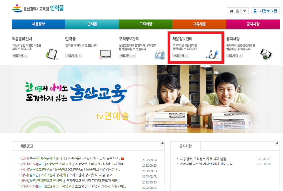 2. 인력풀 사이트에 접속하면 채용정보 관리가 네번째에 있습니다. 이곳에서 학교나 기관의 채용정보를 열람할수 있습니다.