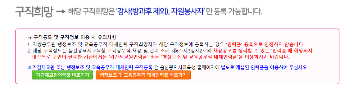 채용게시판에 올라온 구직정보 외에도 자신이 구직을 희망하는 분야를 등록할수 있으며 이 서비스는 강사, 자원봉사자가 이용할수 있습니다.