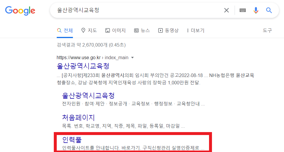 1. 먼저 울산광역시교육청을 포털 사이트 검색창에 검색합니다. 검색시 울산광역시교육청 홈페이지 하단에 인력풀이라는 곳에 접속합니다.