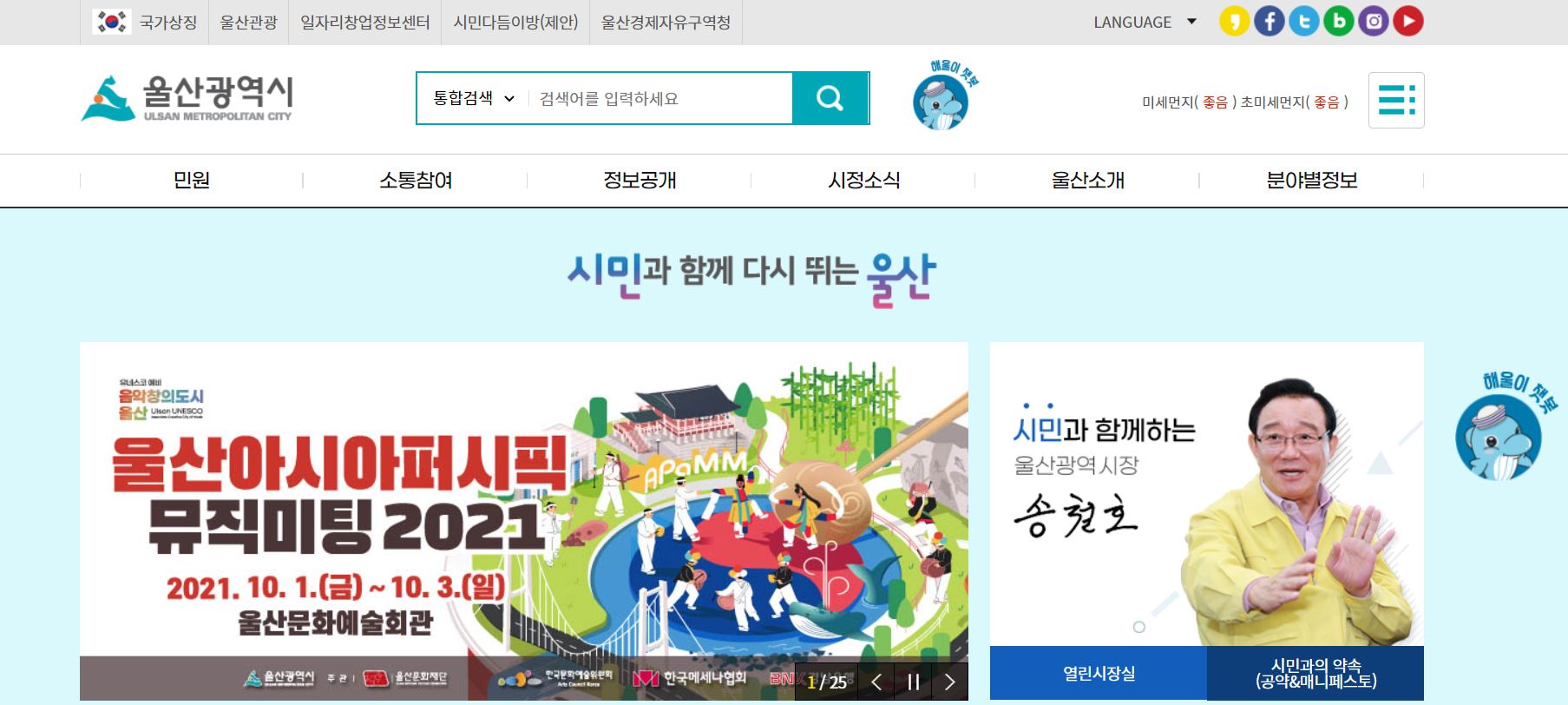 울산시청 홈페이지의 첫 화면입니다.