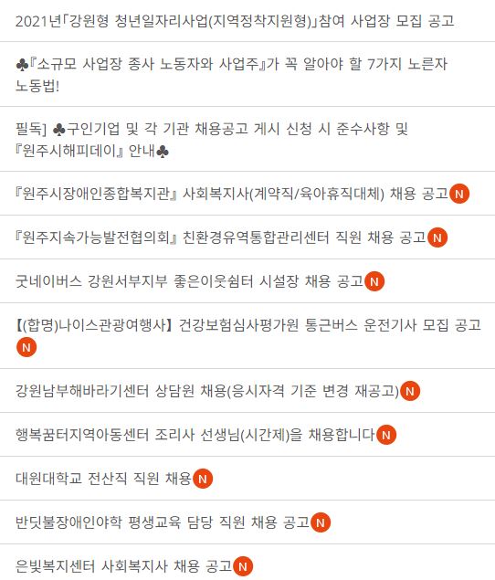 원주시청 홈페이지에는 아래와 같이 취업정보가 있습니다. 구직활동하시는 분들께 유용한 정보입니다.