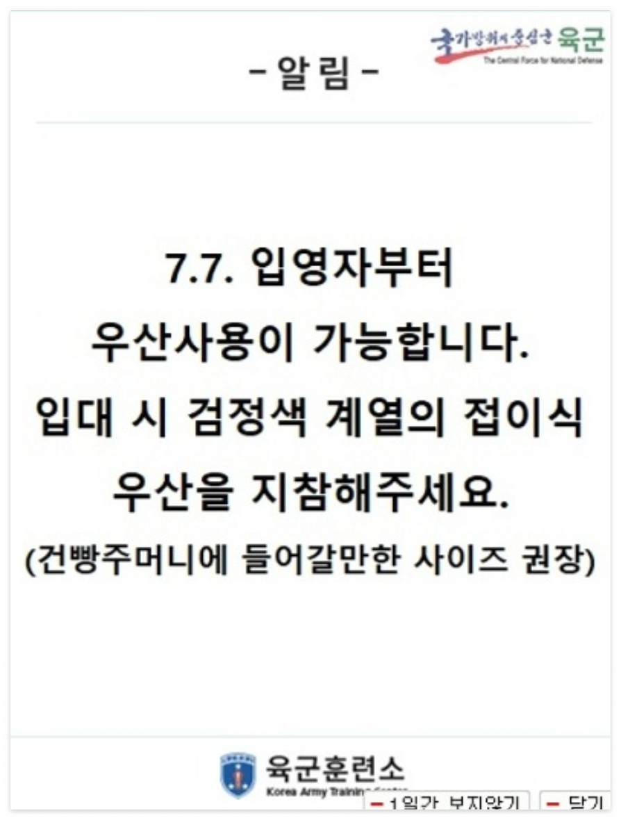 7.7일 입영자부터 건빵주머니에 들어갈 정도로 아주 작은 검은색 계열 접이식 우산사용이 가능하다고 하니 참고하길 바란다.