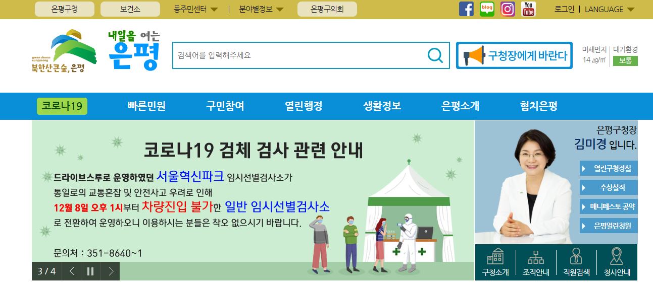 은평구는 서울시 은평구 은평로 195(녹번동)에 위치하고 있으며 홈페이지에서는 다양한 소식과 유용한 정보를 확인할 수 있습니다. 특히 코로나 관련한 소식이 잘 정리되어있어 관심 있는 분들께 많은 도움이 될 것입니다.