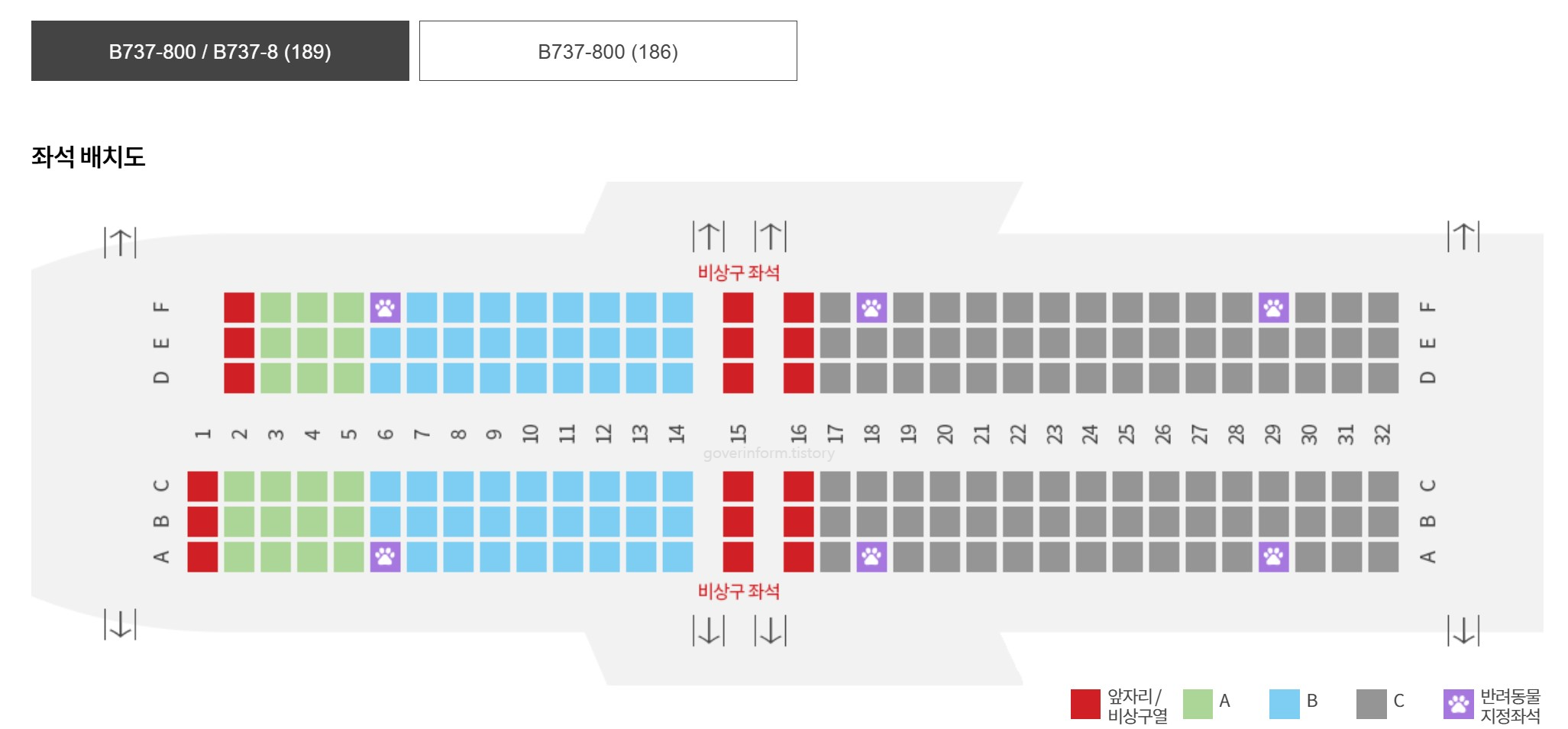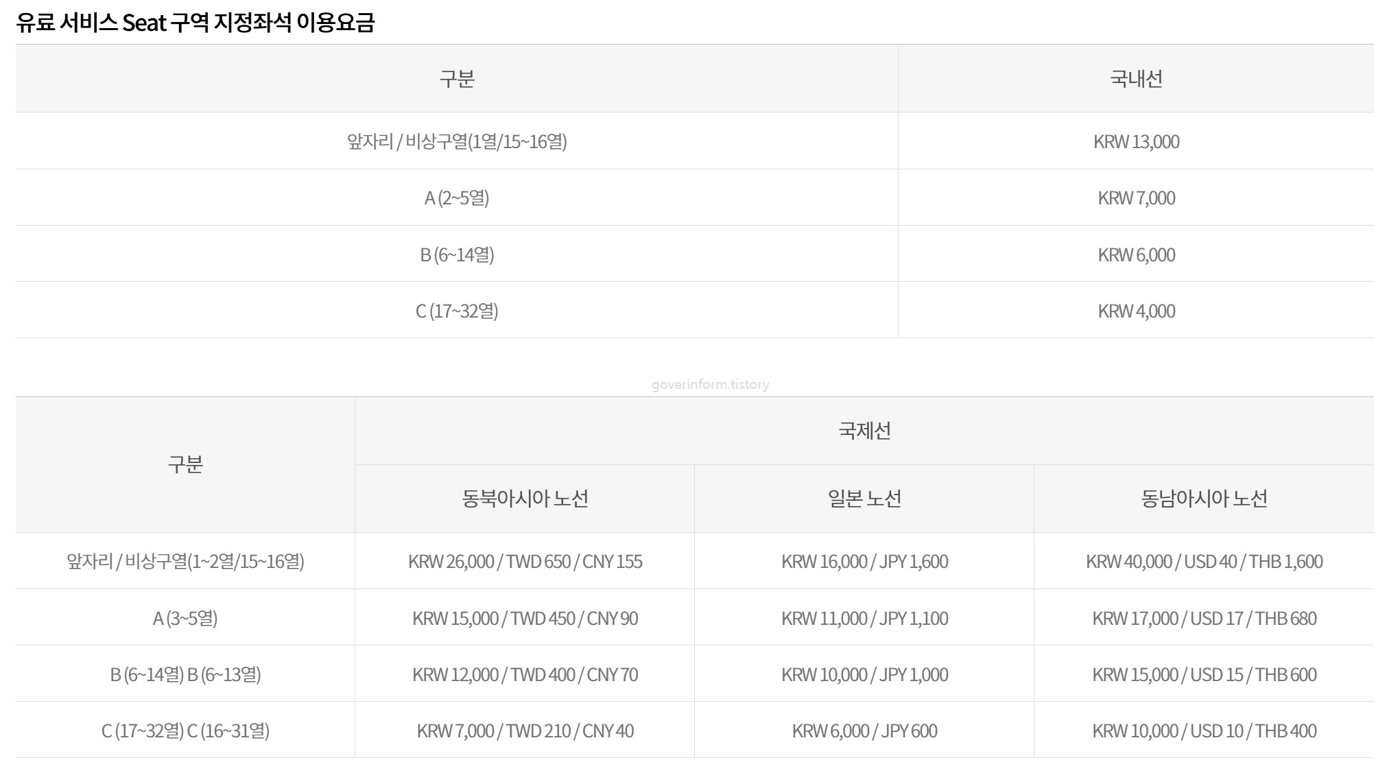 앞자리 / 비상구열(1~2열/15~16열) 동북아 KRW 26,000 일본 KRW 16,000 동남아시아 KRW 40,000