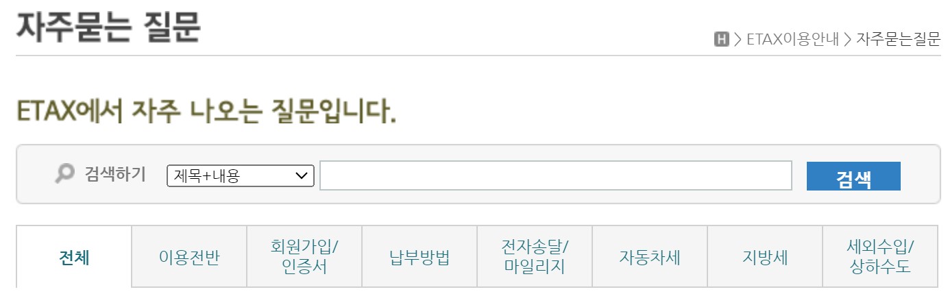 자주 묻는 질문 이용방법: 이택스 자주 묻는 질문에서 질문을 입력하고 검색하기 터치를 하여 이용합니다. 아래 이택스 자주 묻는 질문 바로가기 이용 시 지금 바로 서비스를 편리하게 이용할 수 있습니다.