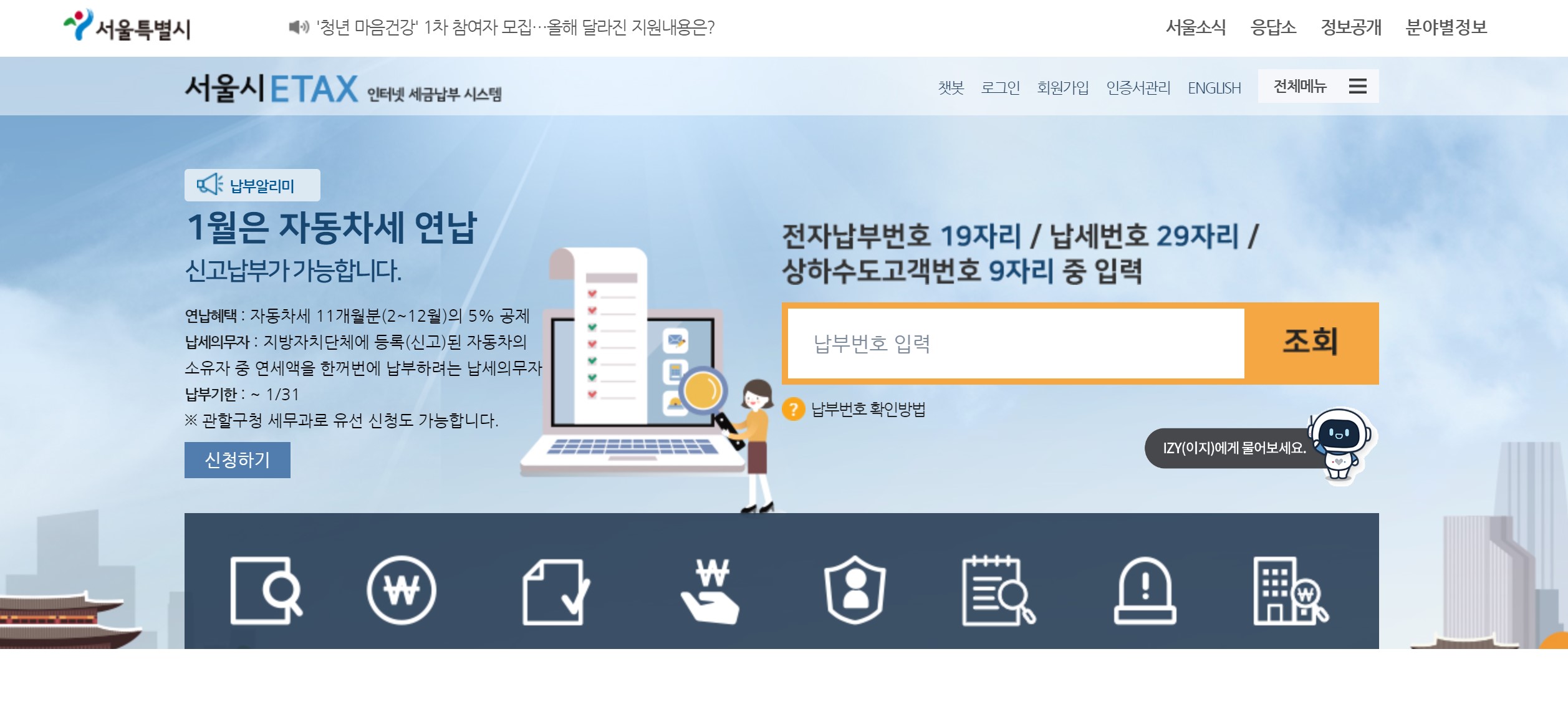 이택스 홈페이지(etax.seoul.go.kr)입니다. 평소 이용하는 홈페이지에 이택스를 검색하거나 좌측 url을 터치하거나 아래 이택스 홈페이지 바로가기를 통해 편하게 이용해도 됩니다. 편한 방법으로 이용 바랍니다.