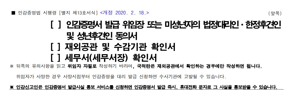 - 인감증명서 발급 위임장 또는 미성년자의 법정대리인, 한정후견인, 성년후견인 동의서, 재외공관(영사관) 및 수감기관(교도소) 확인서, 세무서(세무서장) 확인서 제출 (하단 파일 참조-인감증명법 시행령 별지 제13호 서식)
