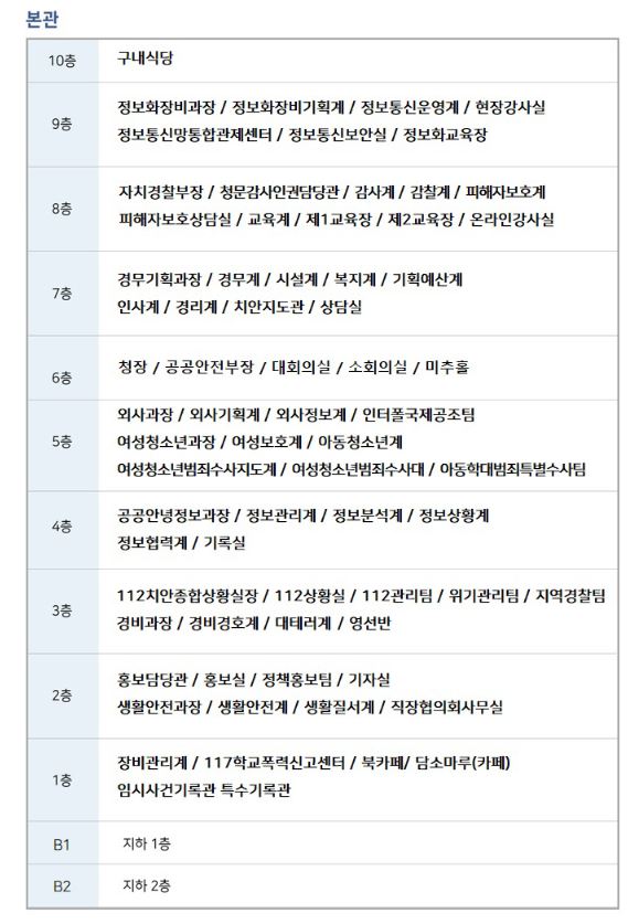 인천경찰청은 본관, 수사동, 별관이 있습니다. 본관은 10층까지 있으며 수사동은 8층, 별관은 2층까지 있습니다.