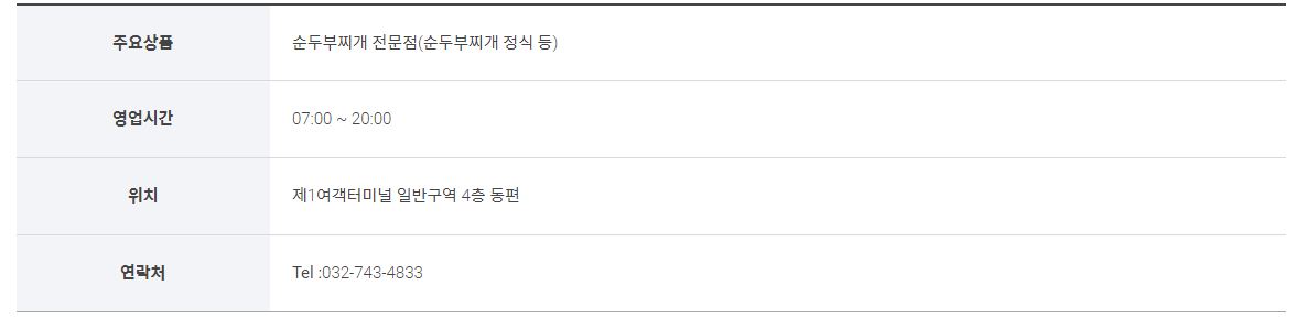 북창동순두부는 제1여객터미널 일반구역 4층 동편에 위치하고 있으며 07:00~20:00 운영시간 참고 바랍니다. 순두부찌개 전문점으로 순두부찌개 정식 등의 메뉴가 있어요.