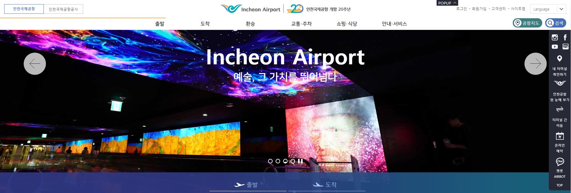 위 사진은 인천국제공항 홈페이지 첫 화면입니다. 비행기 출발 도착 환승에 대한 정보뿐만 아니라 공항 이용에 대한 모든 정보가 총망라되어있으며 공항 이용 꿀팁도 많이 있습니다.