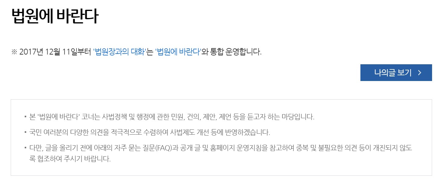 사법정책 및 행정에 관한 민원, 건의, 제안, 제언 등은 '법원에 바란다'> 나의 글 보기에 올리면 됩니다.
