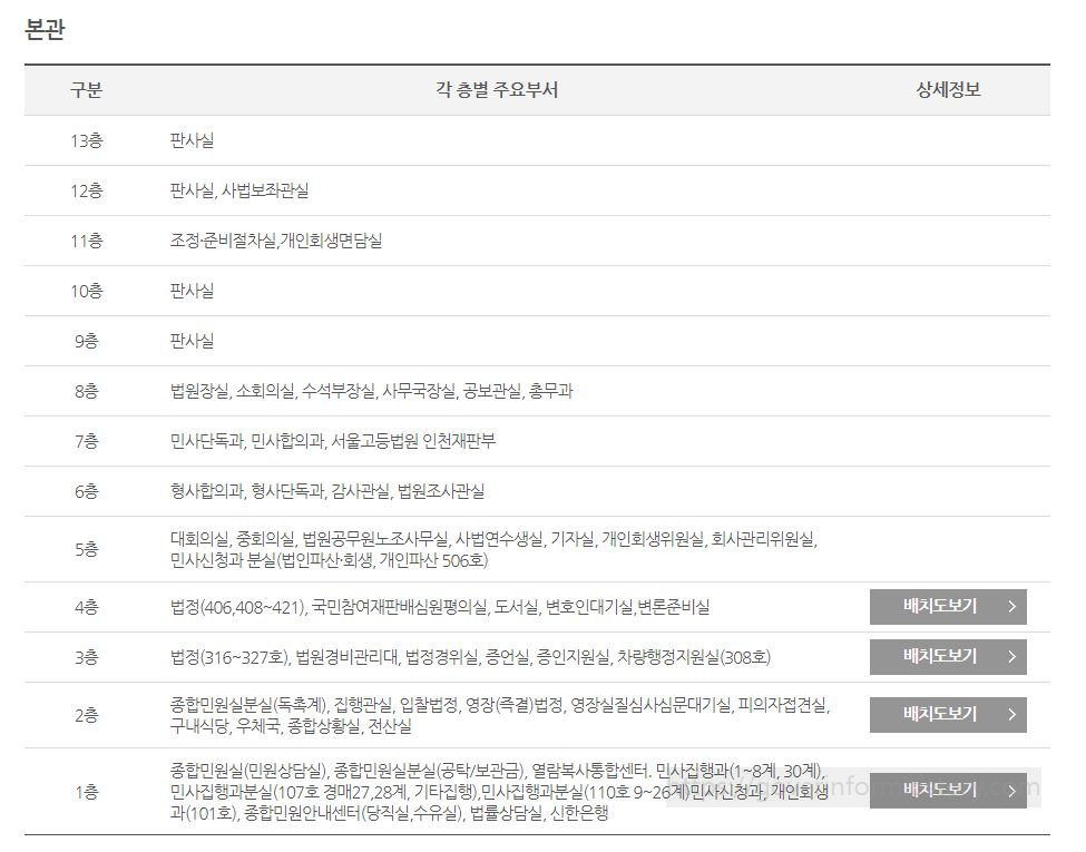 인천지방법원 본관은 13층까지 있습니다. 1층에는 민원실. 열람복사통합센터.은행이 있고 2층에는 민원실. 우체국이 있습니다. 9,10,12,13층에는 판사실이 있고 11층은 조정 준비절차실. 면담실이 있습니다.
