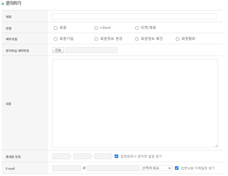 1:1 문의하기는 평일 월~금 09:00~18:00에 이용 가능하며 티켓 취소나 환불에 관한 문의는 대표전화 상담원 연결을 이용해야 합니다. 1:1 문의하기는 실시간 답변이 아닌 시일이 소요되는 서비스로 빠른 답변은 전화를 이용하면 됩니다. 아래 제목, 유형, 세부유형, 문의할 예약번호, 내용, 휴대폰 번호 및 이메일을 기재한 후 이용 가능합니다.
