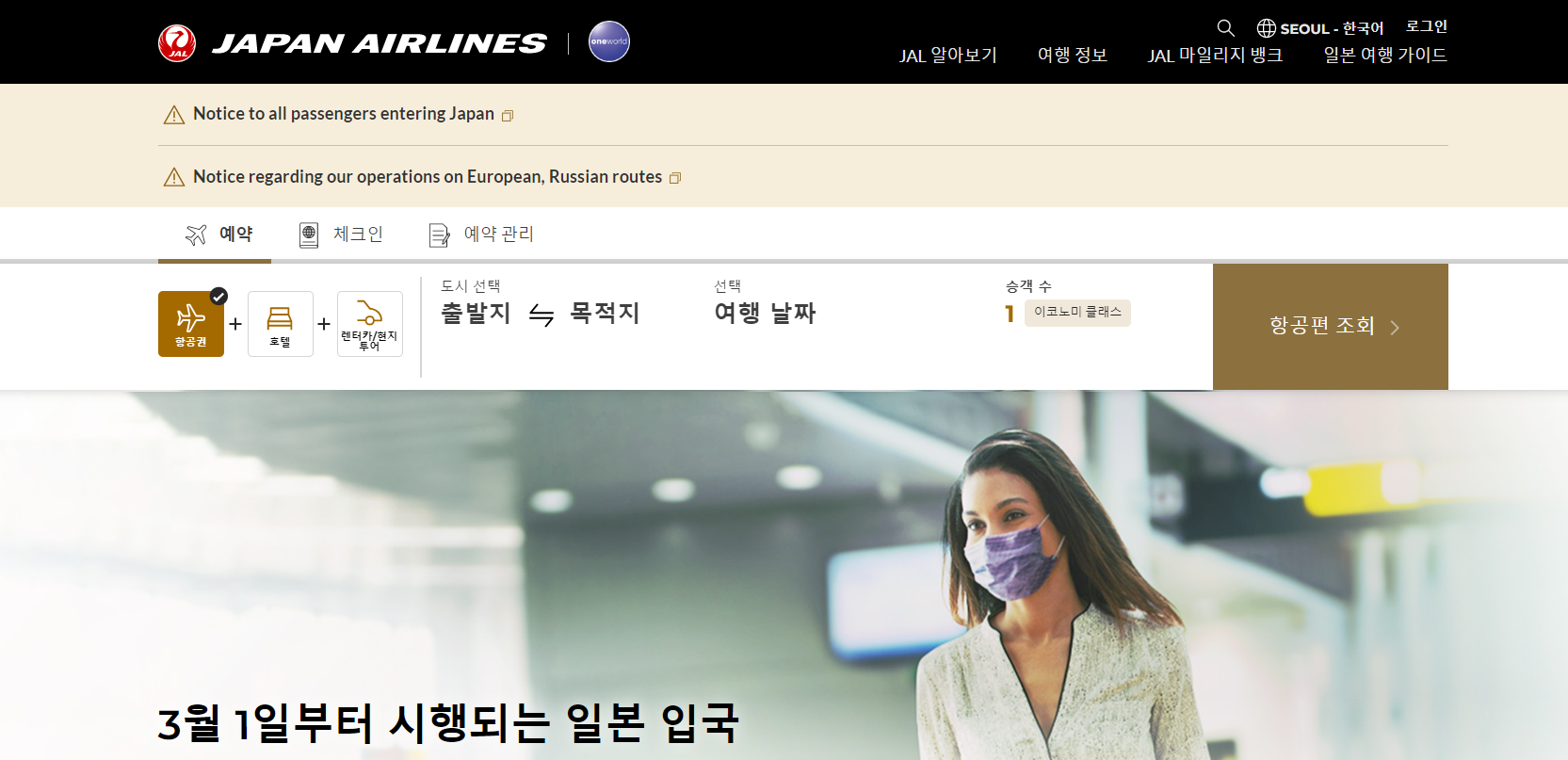 일본항공 홈페이지에 접속해보겠습니다. 일본항공 (https://www.jal.co.jp/kr/ko/)