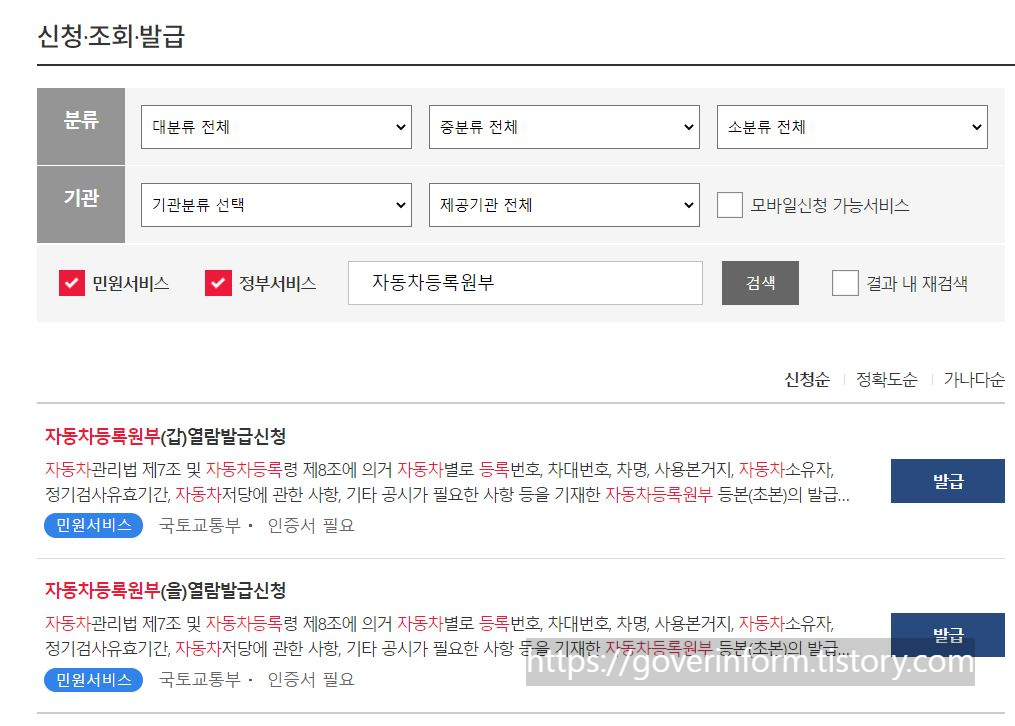 서비스> 민원 신청·조회·발급 순으로 접근한다. 검색어창에 자동차등록원부라고 입력하고 검색하면 자동차등록원부 갑 을 두 가지 메뉴가 나온다. 두 가지의 차이는 담고 있는 정보가 다른데 갑에는 자동차의 주요 사실인 신규, 변경, 이전, 말소, 압류, 경정 등의 사유가 포함되고 을에는 저당권의 설정, 변경, 이전 말소에 대한 사항이 담겨있으므로 참고하여 발급하면 될 것 같다.