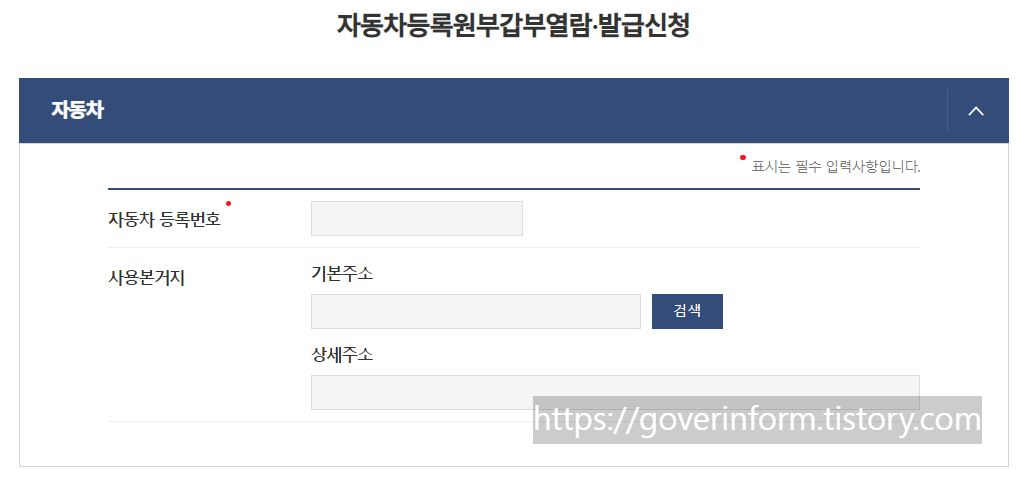 알림 사항 확인 후 하단으로 내려가면 자동차등록원부 신청 페이지가 바로 나오는데 여기에는 자동차 등록번호, 사용본거지를 입력하라는 안내창이 나온다.