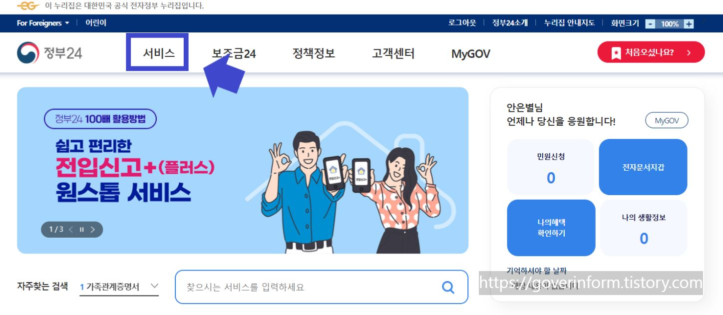 구글 검색창에 정부 24를 입력하고 검색하면 자동차등록원부 발급이 가능하다. 정부 24(https://www.gov.kr/portal) 홈페이지에서 서비스 메뉴에 접근하면 된다.