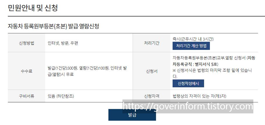 서비스> 민원 신청·조회·발급 순으로 접근한다. 검색어창에 자동차등록원부라고 입력하고 검색하면 자동차등록원부 갑 을 두 가지 메뉴가 나온다. 두 가지의 차이는 담고 있는 정보가 다른데 갑에는 자동차의 주요 사실인 신규, 변경, 이전, 말소, 압류, 경정 등의 사유가 포함되고 을에는 저당권의 설정, 변경, 이전 말소에 대한 사항이 담겨있으므로 참고하여 발급하면 될 것 같다.