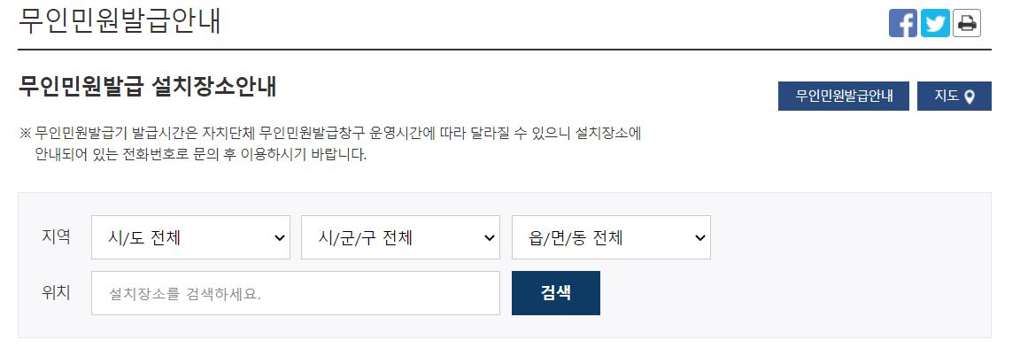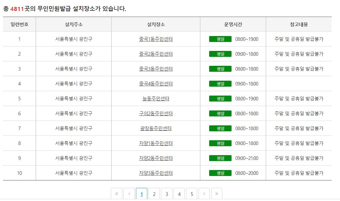 관공서 창구에 굳이 방문하여 대기하지 않아도 간단한 인증절차를 통해 서류를 발급받을 수 있으니 필요하신 분은 이용하시기 바랍니다. 아래 전국 무인민원발급기 검색 바로가기를 통해 확인해보세요. 무인민원발급기 발급시간(24시간, 365일) 및 발급 수수료는 자치단체 사정(조례)에 따라 달라질 수 있습니다.