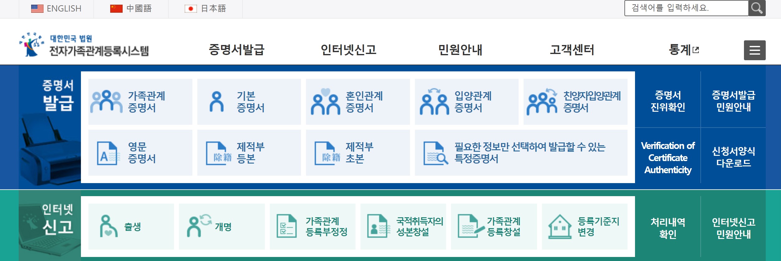 다양한 서비스를 이용하기 원하는 경우 아래 대한민국 법원 전자가족관계등록시스템 홈페이지 바로가기를 이용 바랍니다.